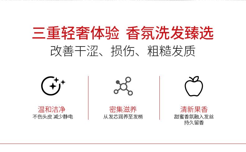 萃取清新蘋果精華,溫潤(rùn)潔凈,滋養(yǎng)強(qiáng)韌秀發(fā),修護(hù)發(fā)絲,令秀發(fā)彈韌柔順有光澤,配合神經(jīng)酰胺成分,溫和修護(hù)頭皮發(fā)絲,改善頭皮油污,帶來輕盈蓬松的飄逸秀發(fā)