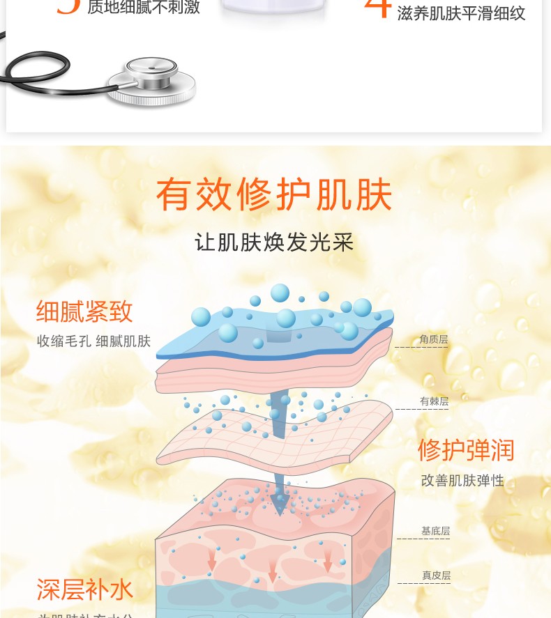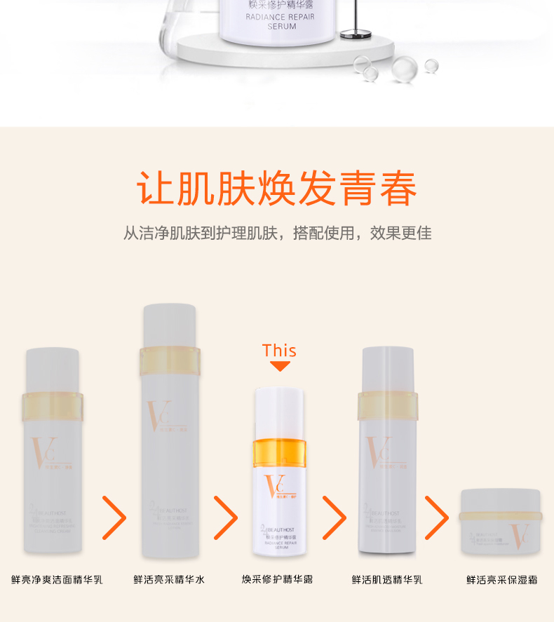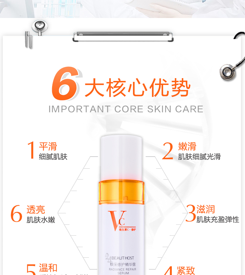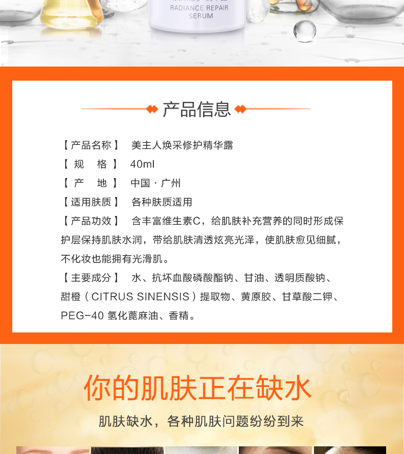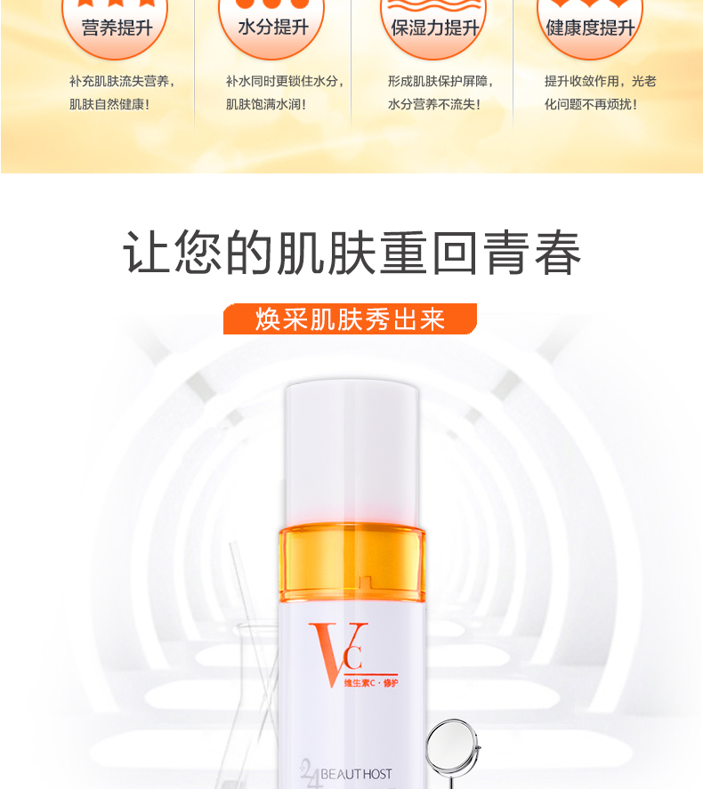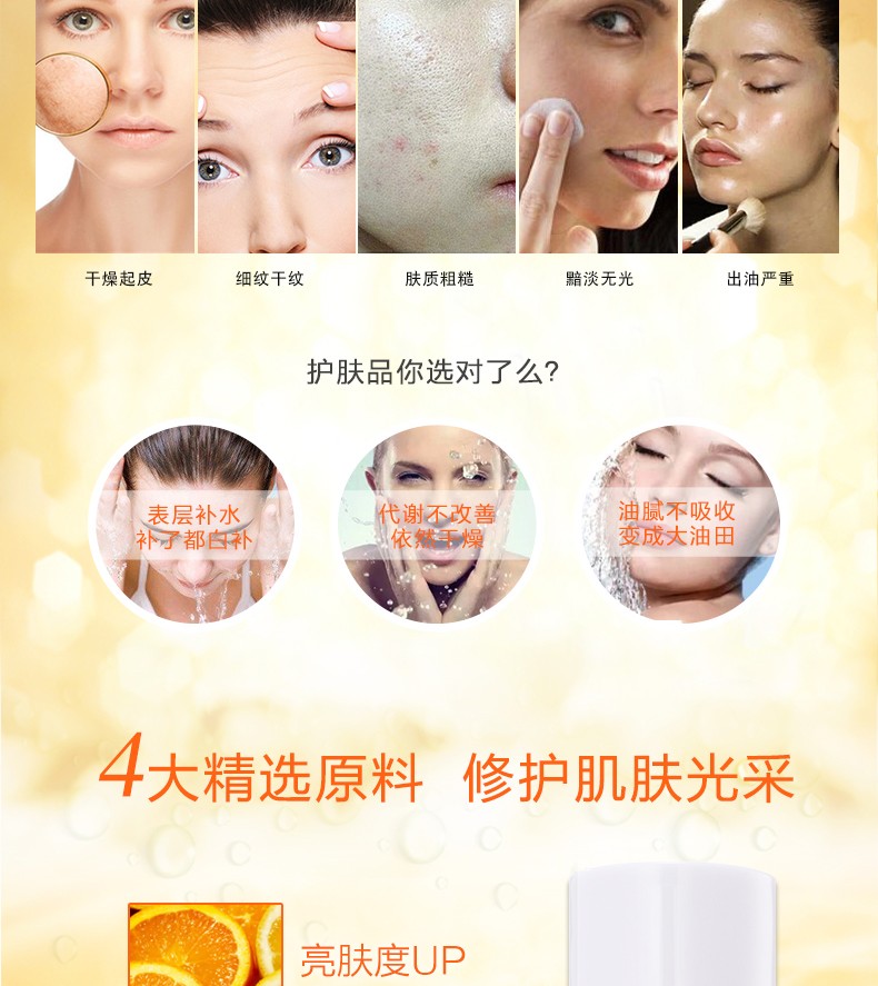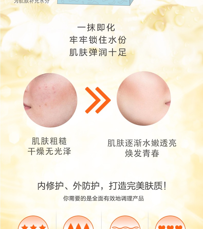 含豐富維生素C,給肌膚補(bǔ)充營養(yǎng)的同時形成保護(hù)層,保持肌膚水潤,帶給肌膚清透炫亮光澤, 使肌膚愈見細(xì)膩, 不化妝也能擁有光滑肌。
