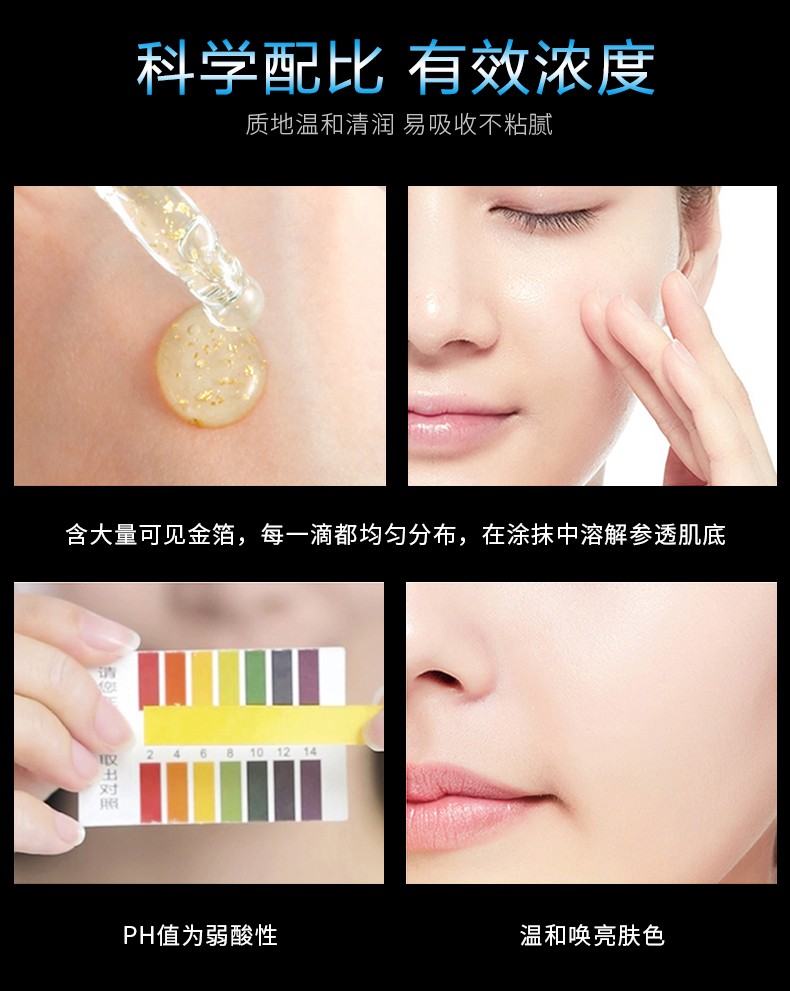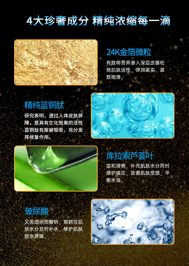 蘊含藍銅肽成分,修護改善膚色不均現(xiàn)象、皮膚粗糙、干燥缺水、毛孔粗大等問題。搭配黃金提取物(金箔),潤滑細紋、滋潤干紋、給予干燥的肌膚補充水分,透亮勻凈,令肌膚光滑緊致。