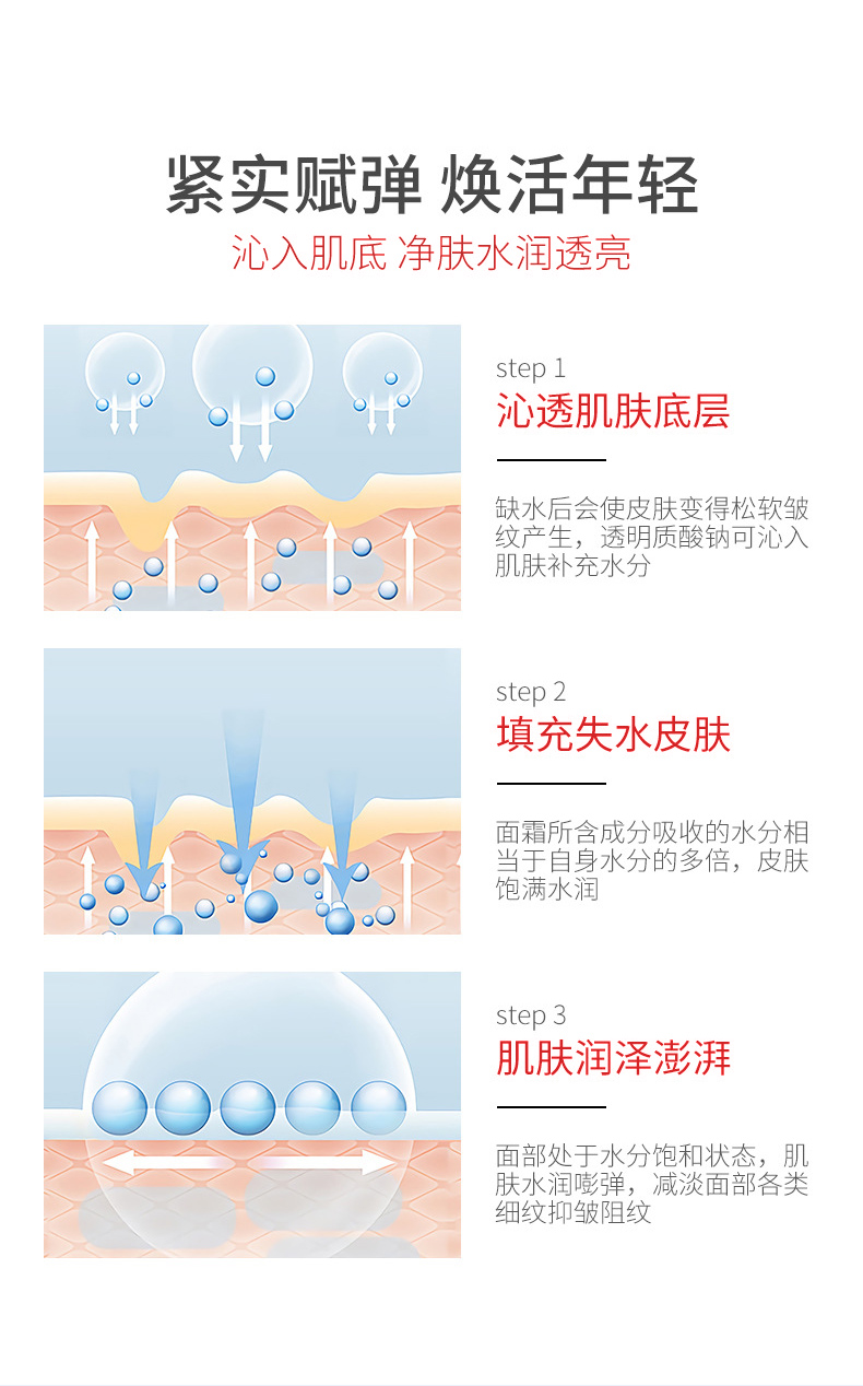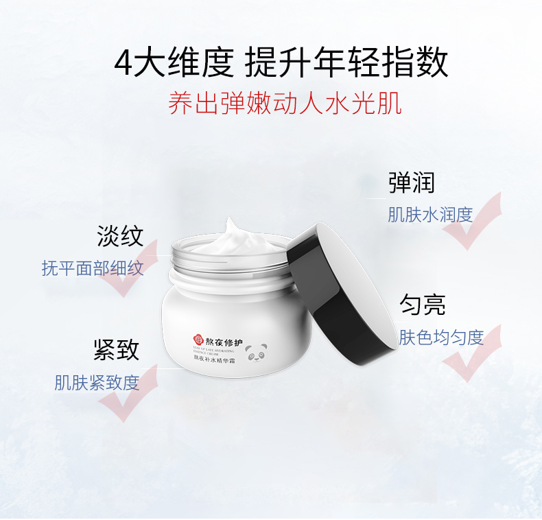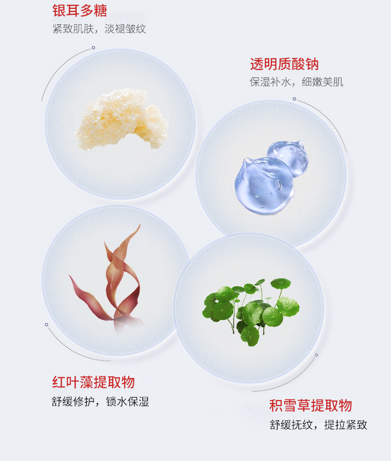 以銀耳多糖、紅沒藥醇、積雪草、二裂酵母、紅葉藻為主要成分,富含高效保濕鎖水、舒緩修護因子。能夠深層滲透肌膚底層,填充失水皮膚,促進角質(zhì)代謝,緊致肌膚,淡化細(xì)紋,給肌膚提供充足的營養(yǎng),令肌膚水嫩彈潤有光澤。
